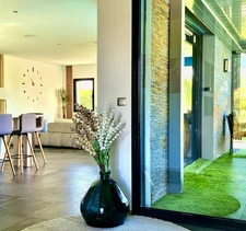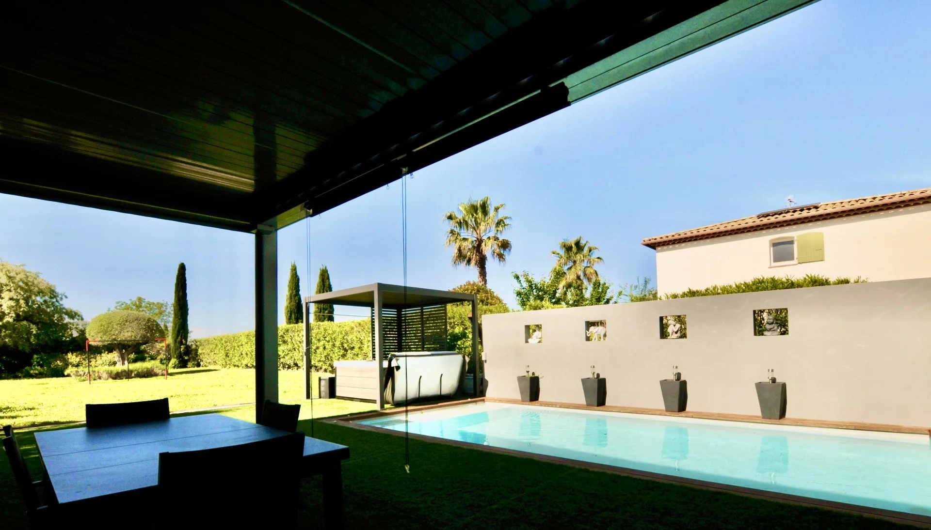Villa premiere ligne golf Dans un cadre privilégié, je vous invite a découvrir cette magnifique villa de 5 pièces en première ligne avec accès direct depuis le jardin au Golf de Montpellier Fontcaude. Coup de coeur assuré pour ce bien d'exception composé de 4 chambres, salon, cuisine, garage et piscine. D'une architecture rare,cette maison contemporaine surélevée d'un demi-étage propose: Au RDC : 2 chambres communicantes avec une salle de bain et wc ,un séjour de taille confortable avec cuisine américaine, le tout entièrement ouvert sur un magnifique jardin paysagé et plat avec un accès direct sur le golf. Au Mi-étage : une chambre pouvant servir de salle de sport et/ou bureau ,une suite parentale avec dressing et salle de bain privative. A l'extérieur, un majestueux jardin de 1500m2 dans lequel vous trouverez tous les ingrédients nécessaires à votre confort et vos loisirs: Piscine, jacuzzi, terrain de pétanque,pergola bio-climatique,accès au golf... Un grand garage automatisé, une buanderie et un cellier viennent compléter l'ensemble. 2 places de parking supplémentaires dans la parcelle et de nombreux stationnement proches de la maison pour accueillir famille et amis. Coté confort : climatisation, panneaux solaires, borne de recharge voiture électrique.... Un bien rare et surtout un emplacement prémium. C'est la seule et unique maison avec un terrain plat et accès au golf . N hésitez pas contactez moi pour une viste