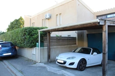 En extérieur : Une grande terrasse avec piscine, un abris voiture.